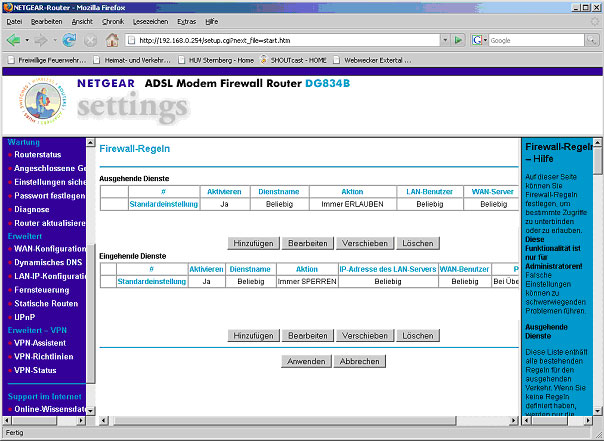 Die Konfiguration des Netgear DG834B sieht wie folgt aus (die Screenshots