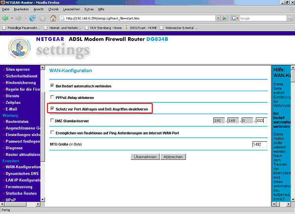 Damit dies nicht passiert, muss im Menü links unter Erweitert, in der WAN-Konfiguration, der Schutz vor Port-Abfragen und DoS-Angriffen deaktiviert werden. Dazu ein Hackchen bei dieser Option setzen.