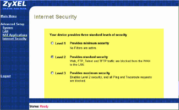 Den Security Level (Manual Seite 3-18) wie auf dem folgenden Screenshot auf Level 1 oder 2 verstellen.