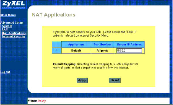 Bei diesem Routertyp (wird auch als Modem bezeichnet) ist die NAT Funktion unter "NAT Applications" einzustellen.