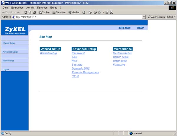 Über das Eingangsmenü (Site Map) gelangt man zum Advanced Setup mit den NAT-Einstellungen.