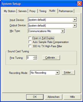 Input Device and Output Device: Spezifiziert die Soundkarte oder ein anderes Gerät das von EchoLink verwendet wird. Dies ist nützlich wenn ein PC mehr als eine Soundkarte eingebaut hat. In den meisten Fällen ist die Einstellung [system default] die Richtige. Mit [system default] wird EchoLink die Aufnahme- und Wiedergabe- Soundgeräte verwenden, die in der Systemsteuerung eingestellt sind.