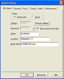 "System Setup" erlaubt die Basis Merkmale einzustellen. Wähle einen der Reiter im oberen Bereich des Fensters um die Optionen von "My Station", "Servers", "Timing", und "Audio" zu sehen. Jeder dieser Reiter ist nachfolgend im Detail beschrieben.