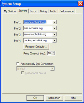 Beachte: Auch wenn die Namen (echolink.org) darauf schliessen lassen könnten, sind die Server nicht unbedingt gemanaged oder betrieben von EchoLink. Diese Domainen-Namen sind zur Vereinfachung der Konfiguration.