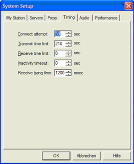 Im "Timing" Reiter werden verschiedene EchoLink time-out Zähler konfiguriert. Die Limitierung der zugewiesenen Zeiten von gewissen Funktionen helfen einen reibungslosen Betrieb von EchoLink und anderen Stationen auf dem System sicherzustellen.