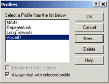Um dieses Merkmal zu verwenden, wähle „Profiles“ im File Menü. Eine Liste mit den gegenwärtig definierten Profilen wird angezeigt; Standardmässig ist nur ein Profil mit dem Namen MAIN definiert. (Das MAIN Profil kann nicht gelöscht oder umbenennt werden).