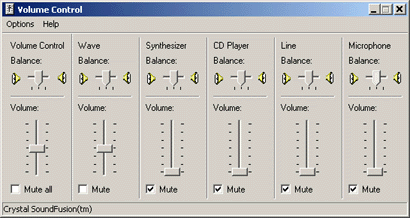 Unter "Windows" befindet sich ein Subprogramm, mit welchem die Pegel und Lautstärke von und zur Soundkarte eingestellt werden können. Dieses sogenannte Windows "Wiedergabesteuerung"- Programm ("Volume Control") kann mit einem Doppelklick auf das kleine Lautsprechersymbol in der rechten unteren Ecke des Windows-Bildschirms gestartet werden. Folgendes Bild wird danach angezeigt: